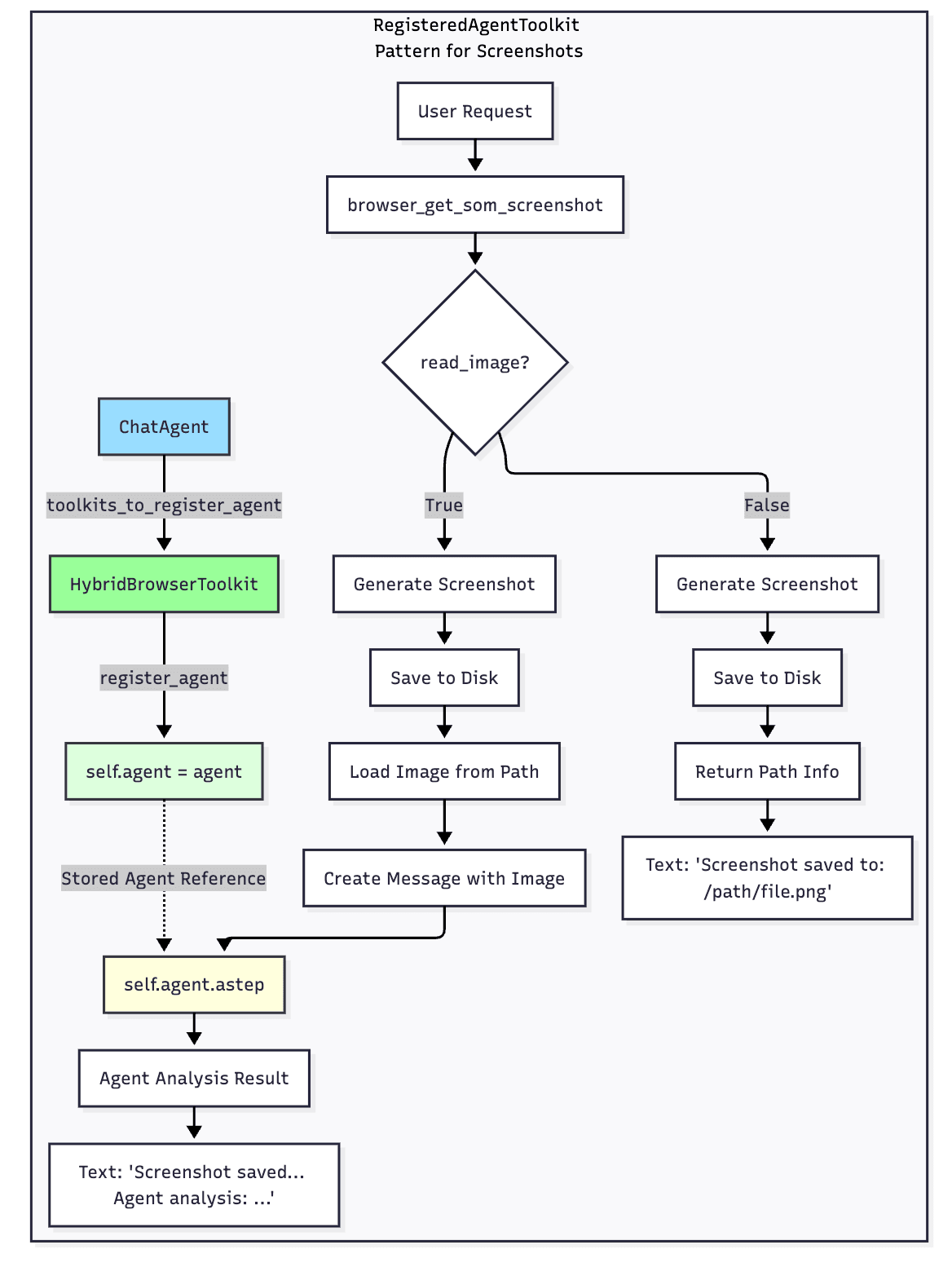 This optimization requires coordination with CAMEL’s Agent registration mechanism. Through the RegisteredAgentToolkit base class, we allow the Toolkit to access the Agent instance that registered it. Specifically, when browser_get_som_screenshot is called, if a registered Agent is detected, the Agent’s astep() method is automatically called, passing a Message object containing the image path. The Agent internally uses PIL to load the image and passes it to the multimodal LLM for analysis.