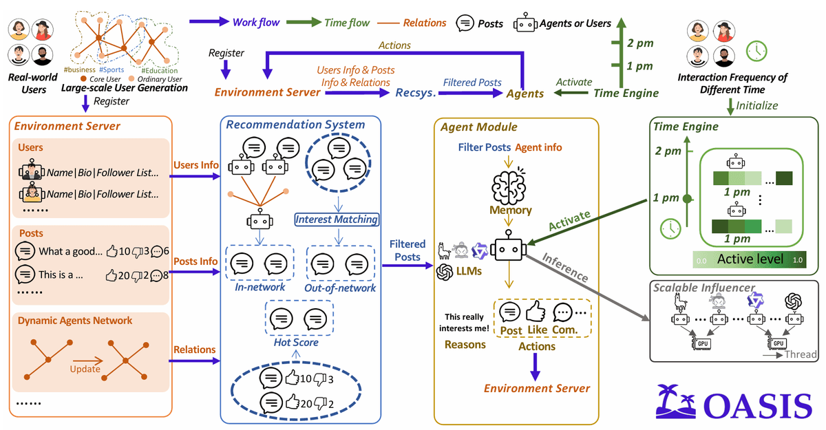 Below is an overview of our workflow. We’ve covered OASIS’s core modules in detail in our paper, where we also reproduced some real-world social phenomena—you can check it out here (https://arxiv.org/abs/2411.11581).