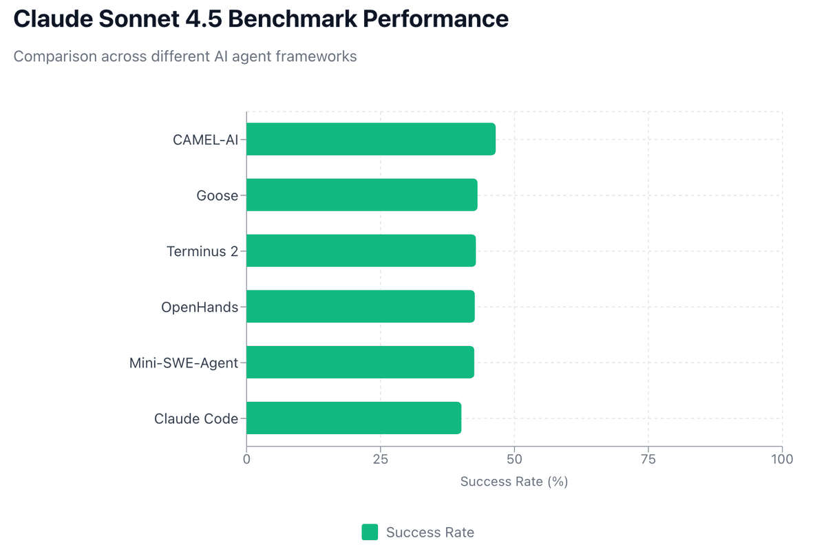CAMEL agent powered by Claude Sonnet 4.5 achieves a 46.5% success rate across 89 real-world terminal tasks, excelling at standard developer workflows—particularly Git operations (80%), DevOps automation (83%), and security analysis (75%)—where Claude's training combines effectively with CAMEL's terminal toolkit for multi-step execution.