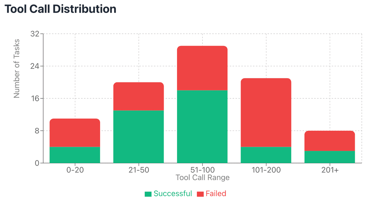 Key efficiency insight: successful tasks averaged 79.8 tool calls versus 128.8 for failures, suggesting efficient problem-solving or strategic retreat. However, some failures reveal unproductive loops (e.g., 452 calls on metacircular evaluator), indicating limitations in progress monitoring.