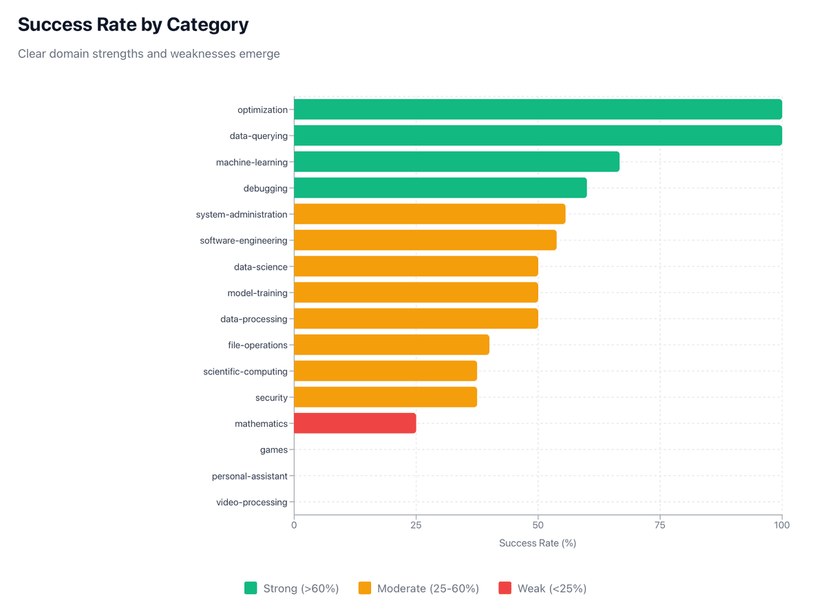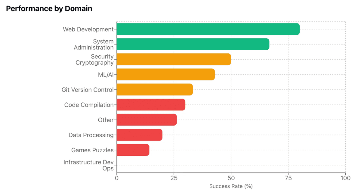 Testing/Maintenance or ML/AI categories, suggesting the model performs reliably on code-related tasks with familiar patterns rather than on entirely novel problem domains.