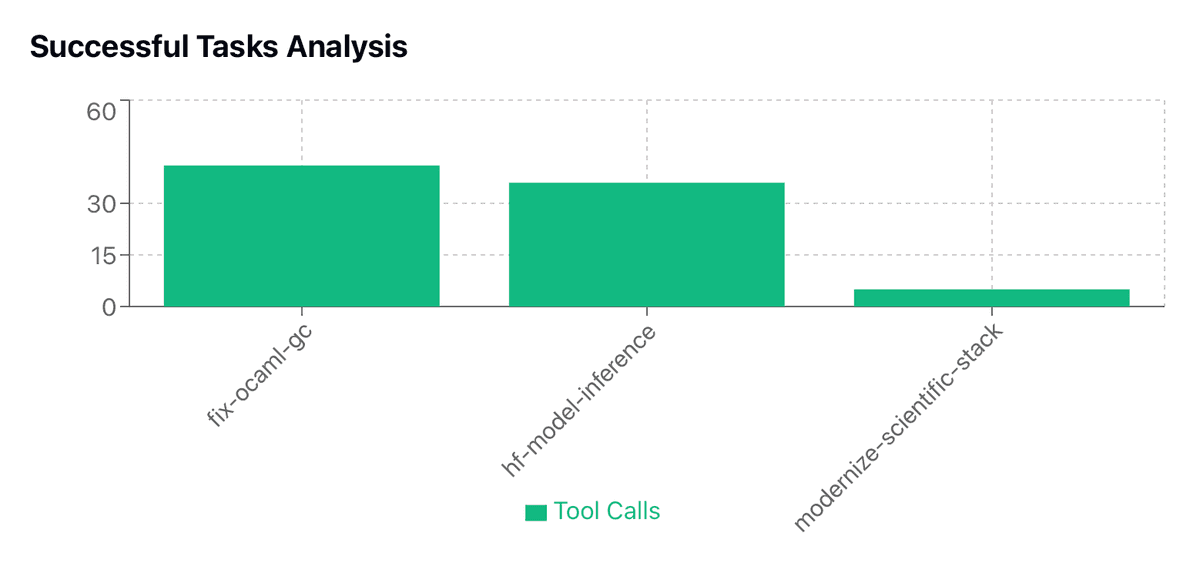 The three successful tasks covered a range of complexity, from the relatively straightforward modernize-scientific-stack (5 calls) to the more involved fix-ocaml-gc (41 calls). The most complex successful task involved 41 iterative tool calls, indicating that Qwen can manage multi-step workflows when provided with explicit error messages, execution outputs, and pass/fail indicators at each iteration. All of the successful cases were in the