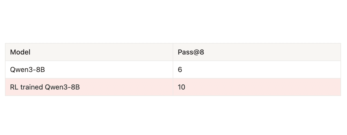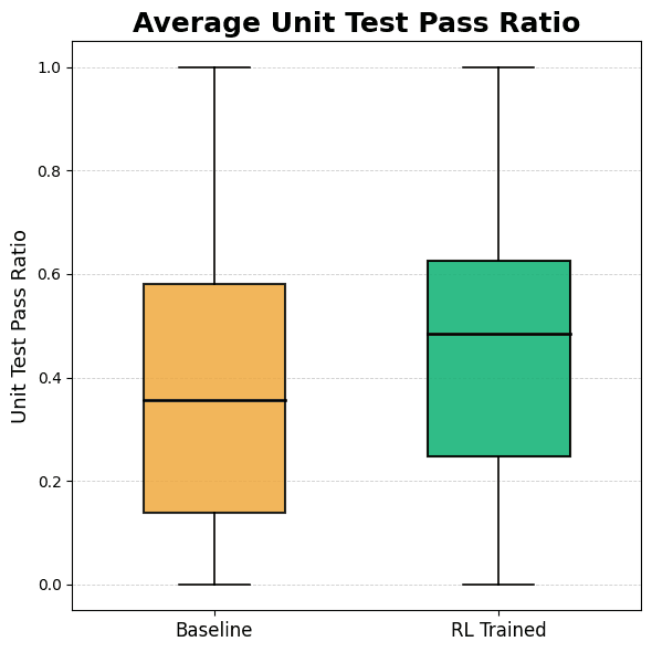 We also compared the unit test pass ratio for each task averaged across 8 runs, and the RL trained model surpassed the baseline model. Across the 79 tasks, the averaged unit test pass ratio was also improved from 0.38 → 0.45, achieving 20.2% improvement.