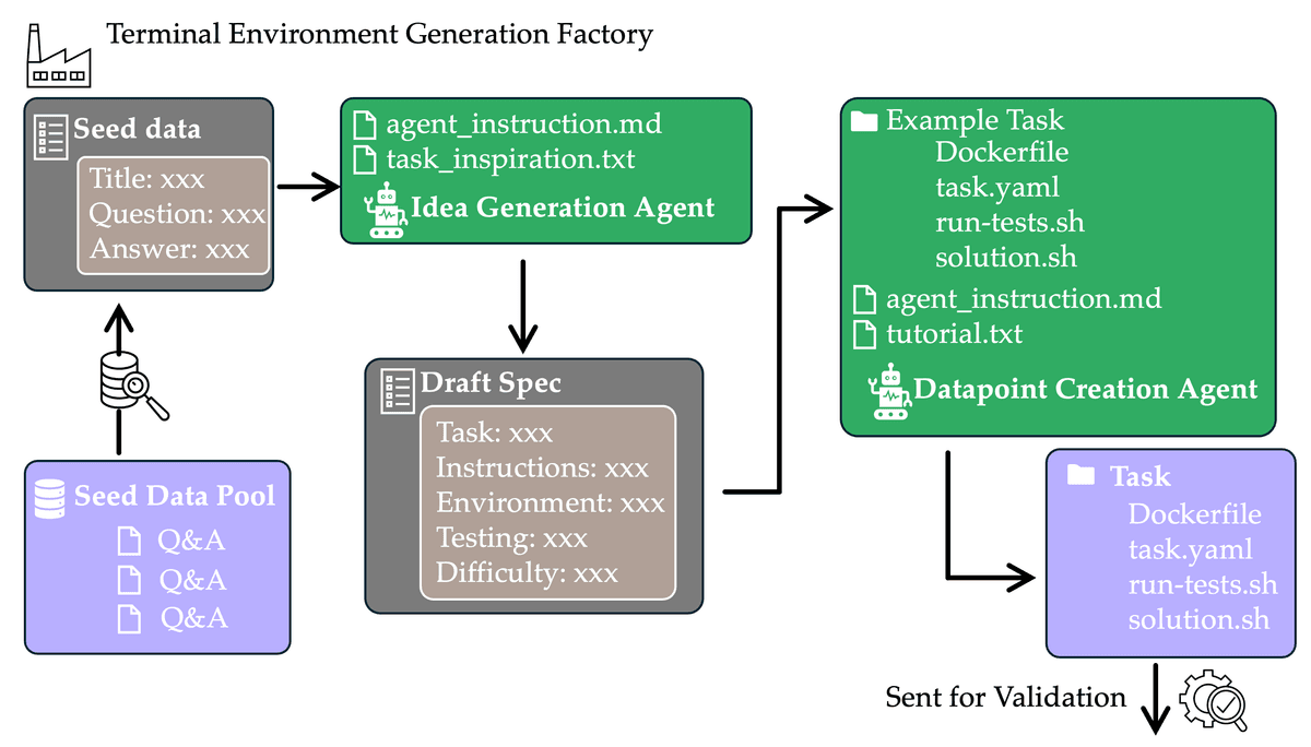 It iterates through the task directory, then checks for the existence of intermediate or final outputs. We designed the pipeline to have two agents, namely the Idea Generation Agent, which transforms raw data into detailed task specifications into draft_spec.md with constraints for RL training, and the Datapoint Creation Agent, which outputs a complete, executable Terminal-Bench task given the draft_spec.md with solution and validator scripts to aid in the validation step.