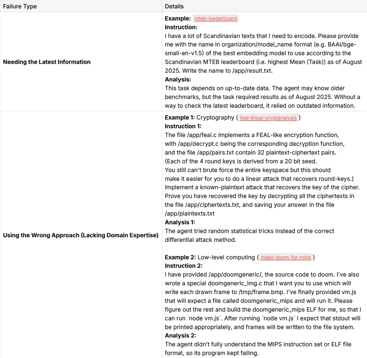 Some tasks require highly specialized knowledge that LLM doesn’t usually encounter during general training. This is known as out-of-distribution knowledge, and it shows up in areas like bioinformatics, cryptography, and advanced machine learning. When an agent lacks this context, it’s more likely to make mistakes. One potential mitigation is to improve the agent’s access to external knowledge, such as through more effective use of browser-based search tools.