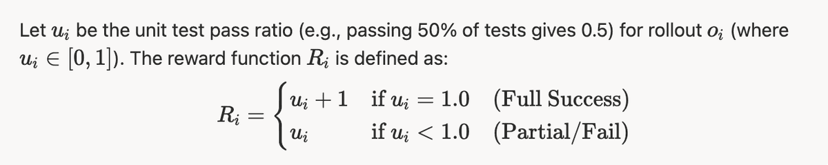 We followed GRPO training setup. The binary 0/1 reward based on task success or failure is too sparse for calculating advantage (the model doesn't learn from its near-misses), so we turn to calculate the unit test pass ratio for each rollout as reward. An additional bonus reward 1 was assigned to fully succeeded rollout to encourage completing the tasks. To be more specific: