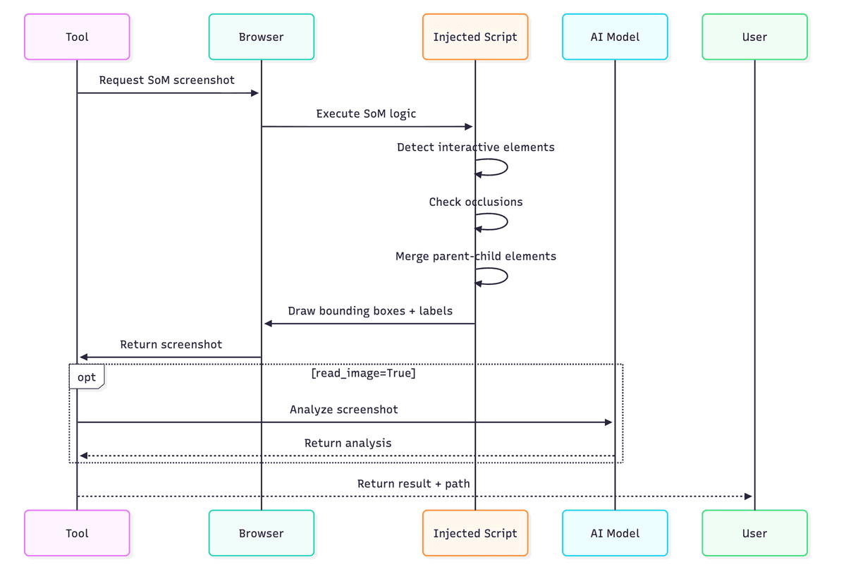 1. Injection-based Implementation: The SoM (Set of Marks) functionality is injected directly into the browser context, ensuring accurate element detection and positioning