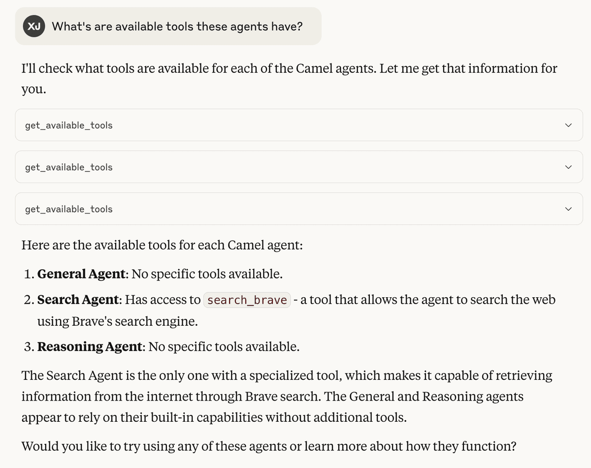 This agent can search for relevant MCP servers, explain their capabilities, and even execute queries using them. For example, asking about Gmail tools would return information about various Google Workspace servers, while a query about CAMEL-AI would search the web and return comprehensive information about our organization.
