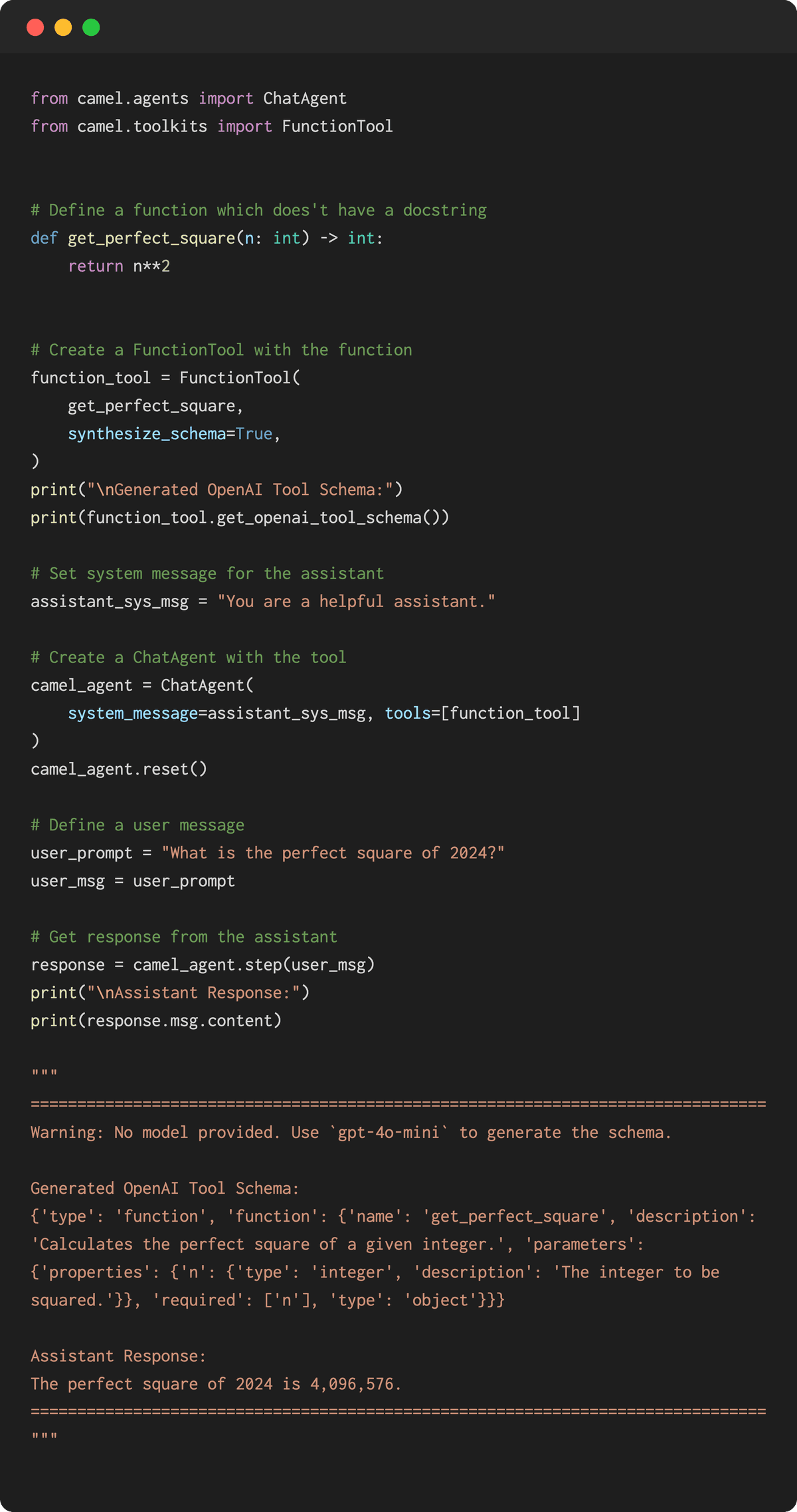 - Added a new feature that allows for generating OpenAI tool schemas: This enhancement to the FunctionTool class introduces the generate\_docstring method, which utilizes an optional assistant model (defaulting to GPT_4O_MINI) for schema generation. It includes robust schema validation and a retry mechanism to ensure reliability. Thanks to our contributor Zhangzeyu97 for this fantastic work! 🤝 Explore more here.