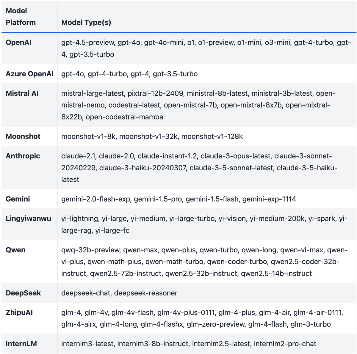 CAMEL-AI supports multiple models, as detailed in the table below, and continues to integrate new ones: