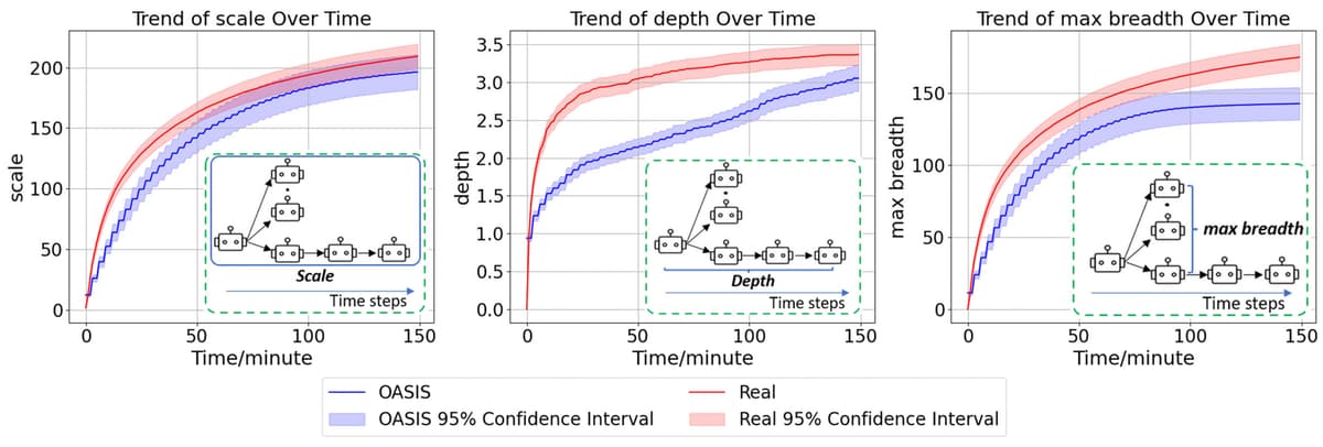 Using real data, we replicated message propagation trends in OASIS, comparing them in terms of scale, depth, and maximum reach. The results show that OASIS's design effectively replicates real-world message propagation trends, providing a foundation for studying the evolution of more complex opinion spreading.