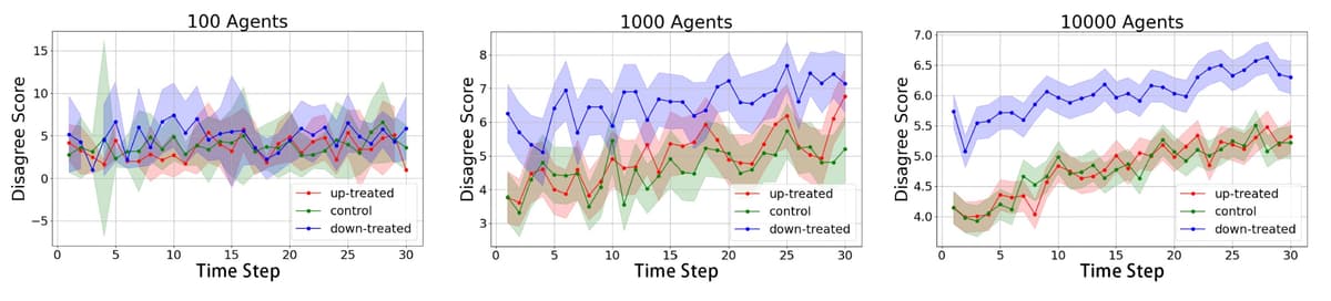 - π More agents lead to more enhanced dynamic: We injected a significant number of counterfactual posts into the Reddit environment and analyzed the herd effect with varying numbers of agents. It was observed that the larger the number of agents, the clearer the behavioral trends of the entire group.