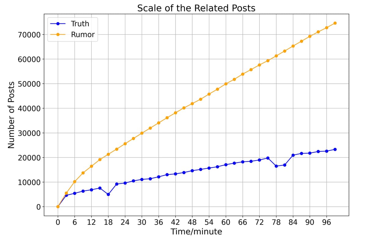 - π£οΈ Simulating rumor propagation among a million agents: We created four pairs of rumors and truths, each pair sharing the same topic. We tracked the number of posts related to both rumors and truths over time, observing their trends. The results show that rumors have a greater impact on the group than the truths.