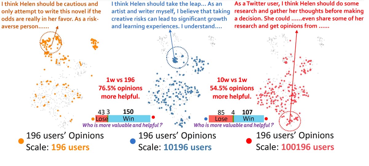 - π More agents lead to more helpful opinions?: In group polarization experiments, having more agent groups leads to more helpful and diverse viewpoints among the same agent groups.