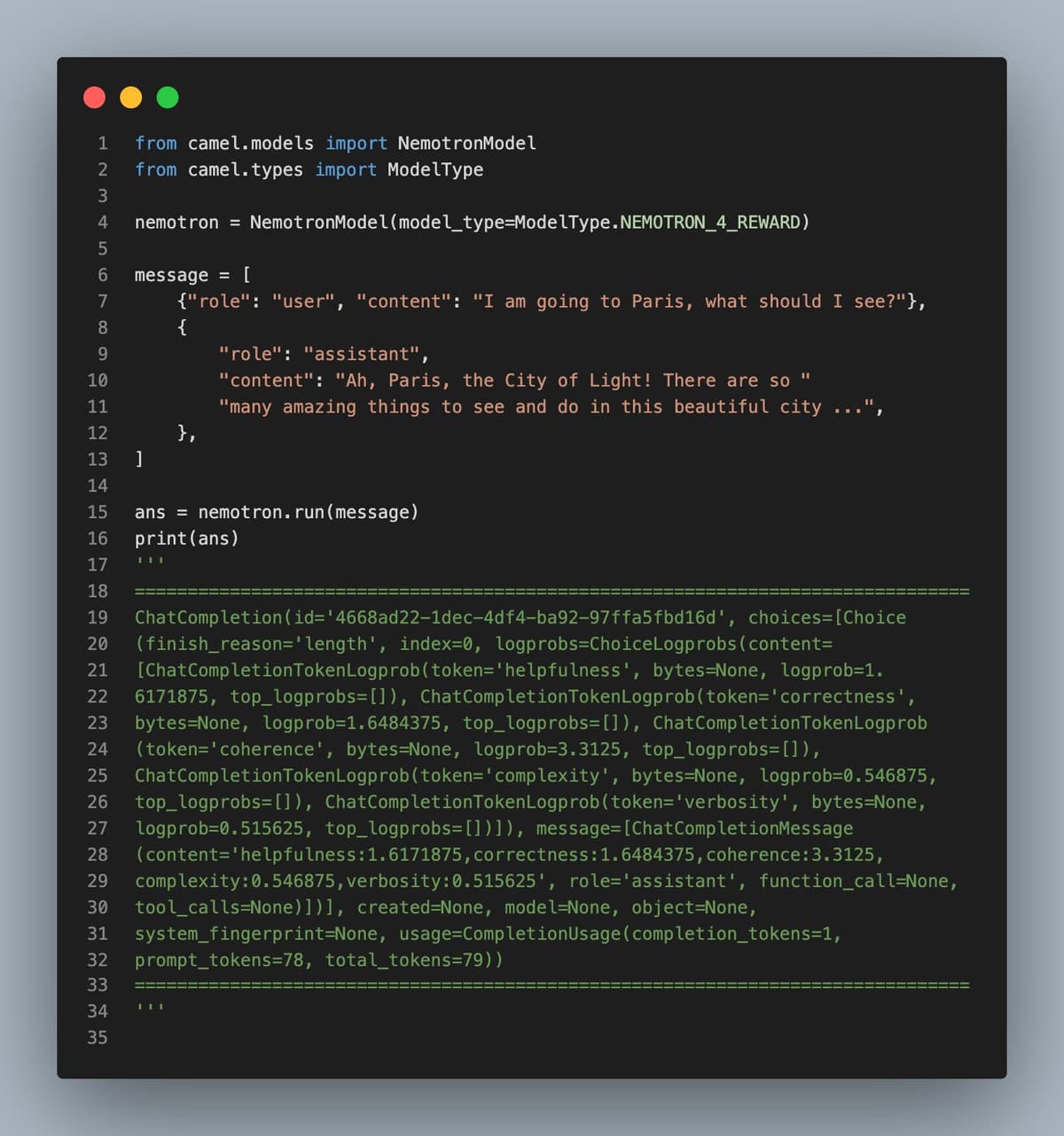- π Nemontron API Integration: We've integrated Nemotron-4 340B Reward Model from Nvidia, Nemotron-4 340B Reward Model is a state-of-the-art multidimensional Reward Model. The model takes a text prompt as input β and returns a list of floating point numbers that are associated with the five attributes in the HelpSteer2 dataset, Nemotron-4 340B Reward can align with human preferences for a given prompt and is therefore able to replace a large amount of human annotations. Thanks to Wendong-Fan for this implementation. π€ Explore more here.