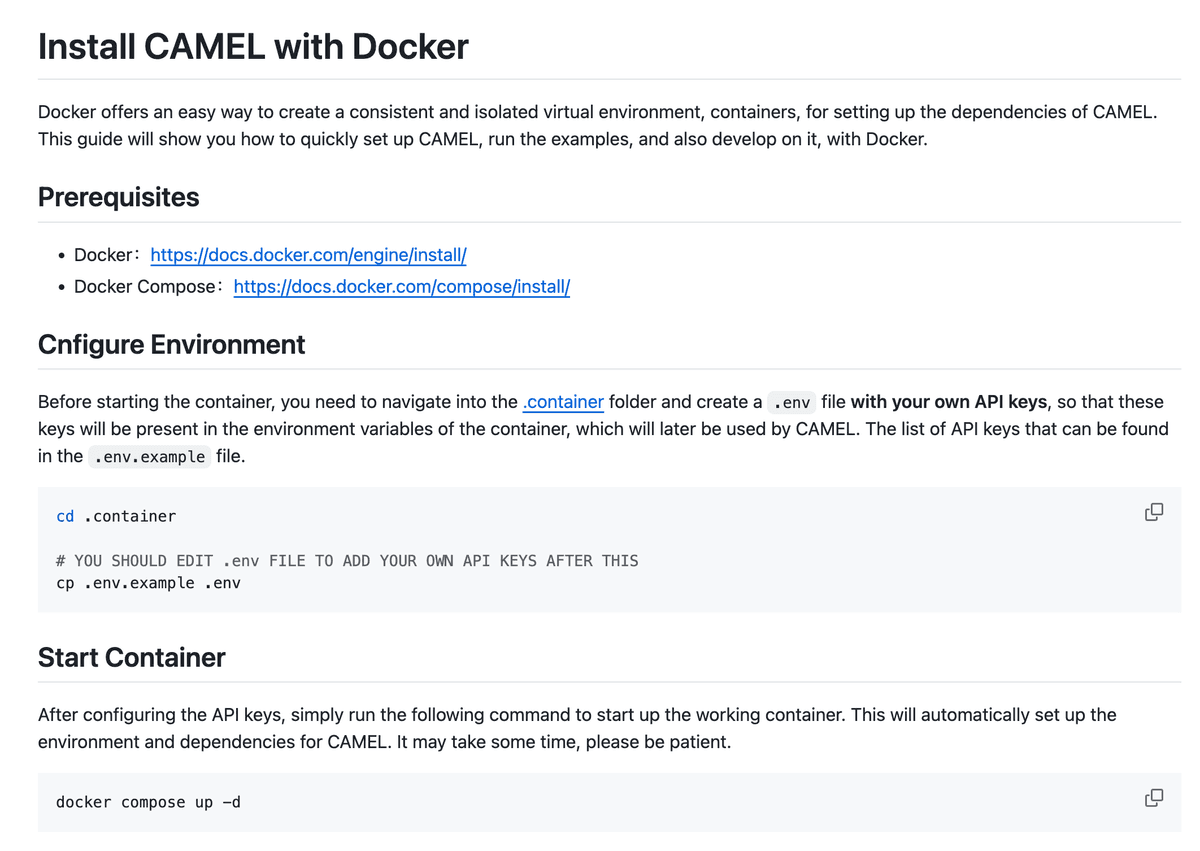 - π‘ Docker Compose Support: Docker support is now available for installing the CAMEL π« framework, providing a consistent and isolated environment for easy setup and development. Thanks to koch3092 for this contribution. π€ Explore more here.