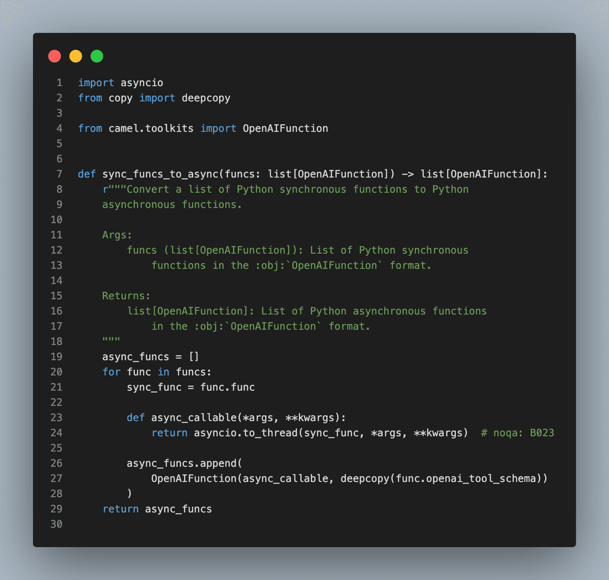 - π Sync to Async Conversion Utility: The new sync_funcs_to_async utility converts synchronous functions to asynchronous, ensuring smooth, concurrent operations. Thanks to zechengz for making this possible. π€ Explore more here.