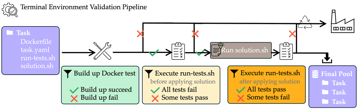 It iterates through the task directory, then checks for the existence of intermediate or final outputs. We designed the pipeline to have two agents, namely the Idea Generation Agent, which transforms raw data into detailed task specifications into draft_spec.md with constraints for RL training, and the Datapoint Creation Agent, which outputs a complete, executable Terminal-Bench task given the draft_spec.md with solution and validator scripts to aid in the validation step.